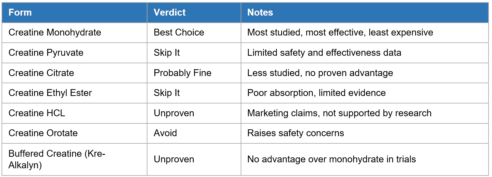 The bottom line: buy plain creatine monohydrate from a reputable brand. It is the cheapest option and the only one with decades of solid research behind it. Look for pharmaceutical grade. Also note that creatine powder is stable on a shelf, but it starts to break down if you mix it into a liquid and let it sit. Mix it fresh.