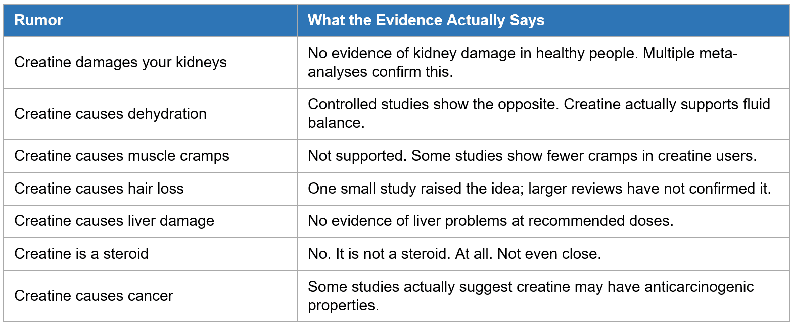 A 2025 meta-analysis looked at creatine's effect on creatinine levels (the kidney marker). Creatine does raise serum creatinine slightly, but this reflects normal creatine metabolism, not kidney damage. Actual kidney filtration rate was unchanged.