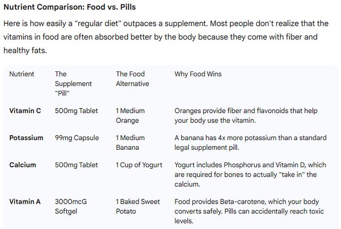 Here is how easily a “regular diet” outpaces a supplement. Most people don’t realize that the vitamins in food are often absorbed better by the body because they come with fiber and healthy fats.